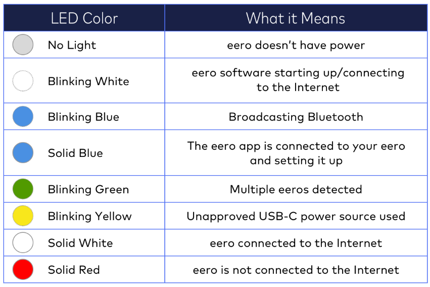 On the front of your eero, there is a LED status light. When everything is running correctly, your eero's light will be solid blue (unless you have turned it off). If your LED is in a different state, including a different colour or is blinking/flashing, please refer to the list below: